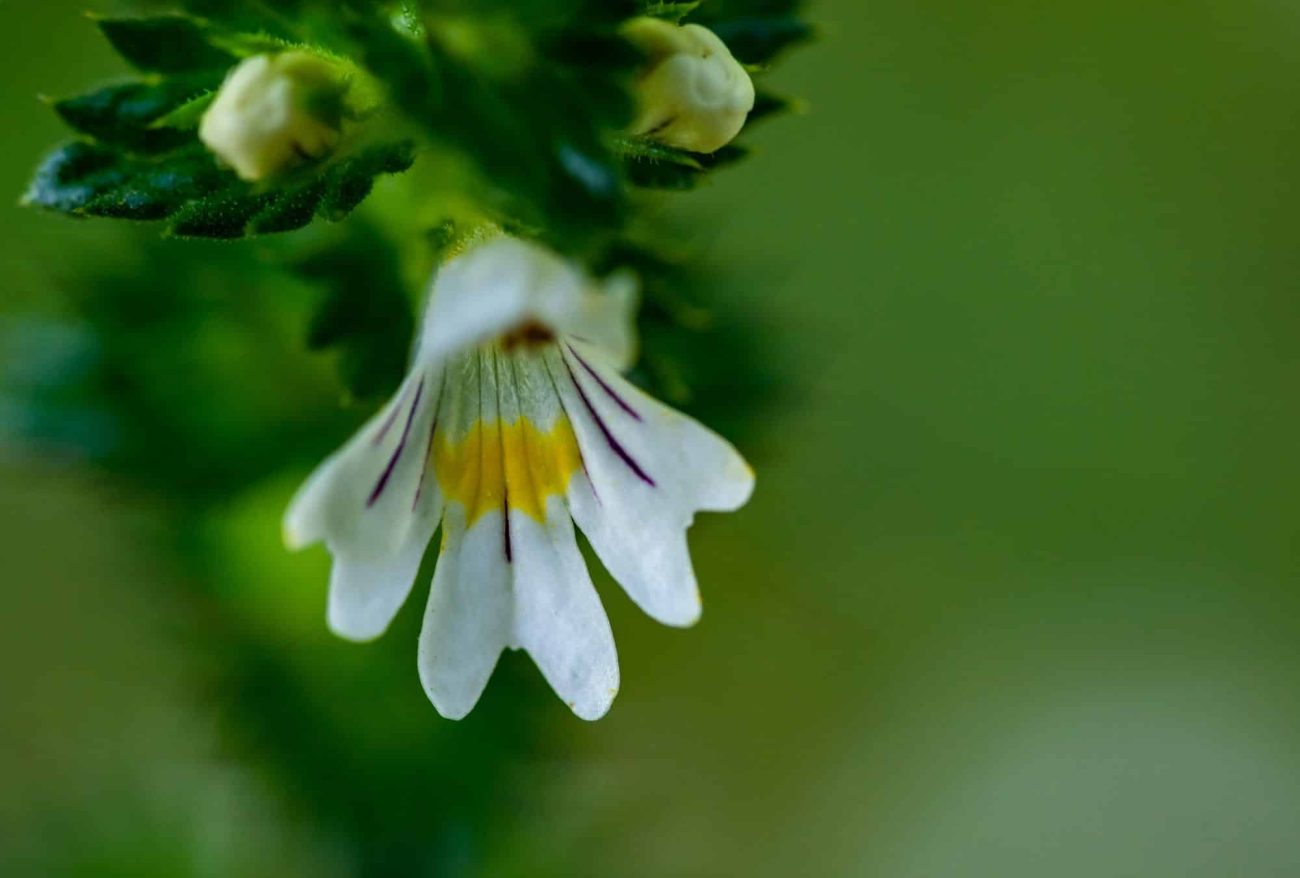 By the doctrine of signatures (a concept that states that botanical features of herbs may indicate their therapeutic applications) the petals of eyebright resemble bloodshot eyes, suggesting the plant’s name and its eye-clearing action. Downy hairs cover the stems, which produce toothed leaves.