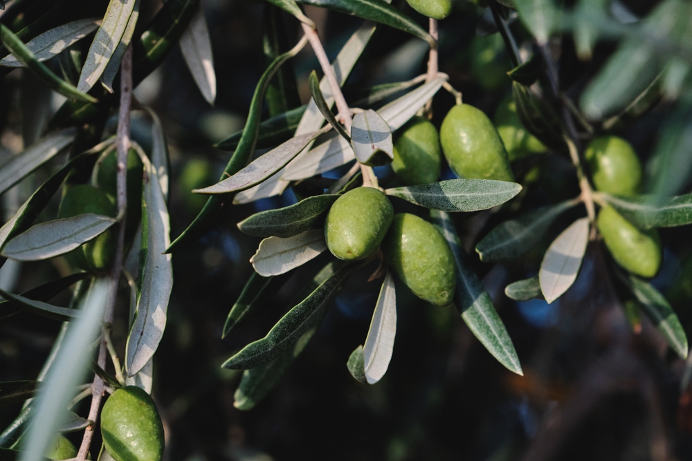 Olives are evergreen, medium-sized trees. They grow on strong, often gnarled and twisted dwarfed trunks. The elliptical, dark green and tough textured leaves are covered in tiny hairs and arranged oppositely along the young stems. The leaves have a characteristic silvery-green appearance.