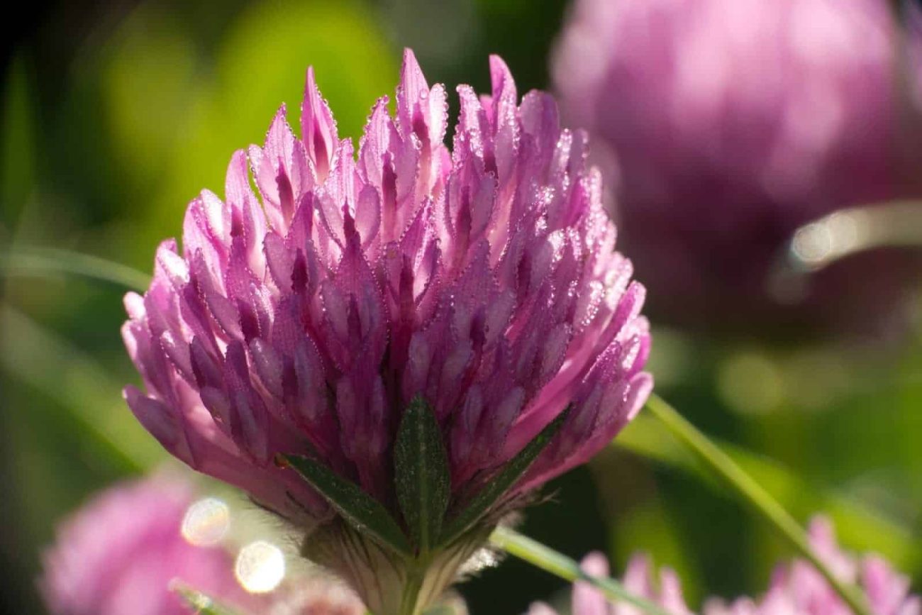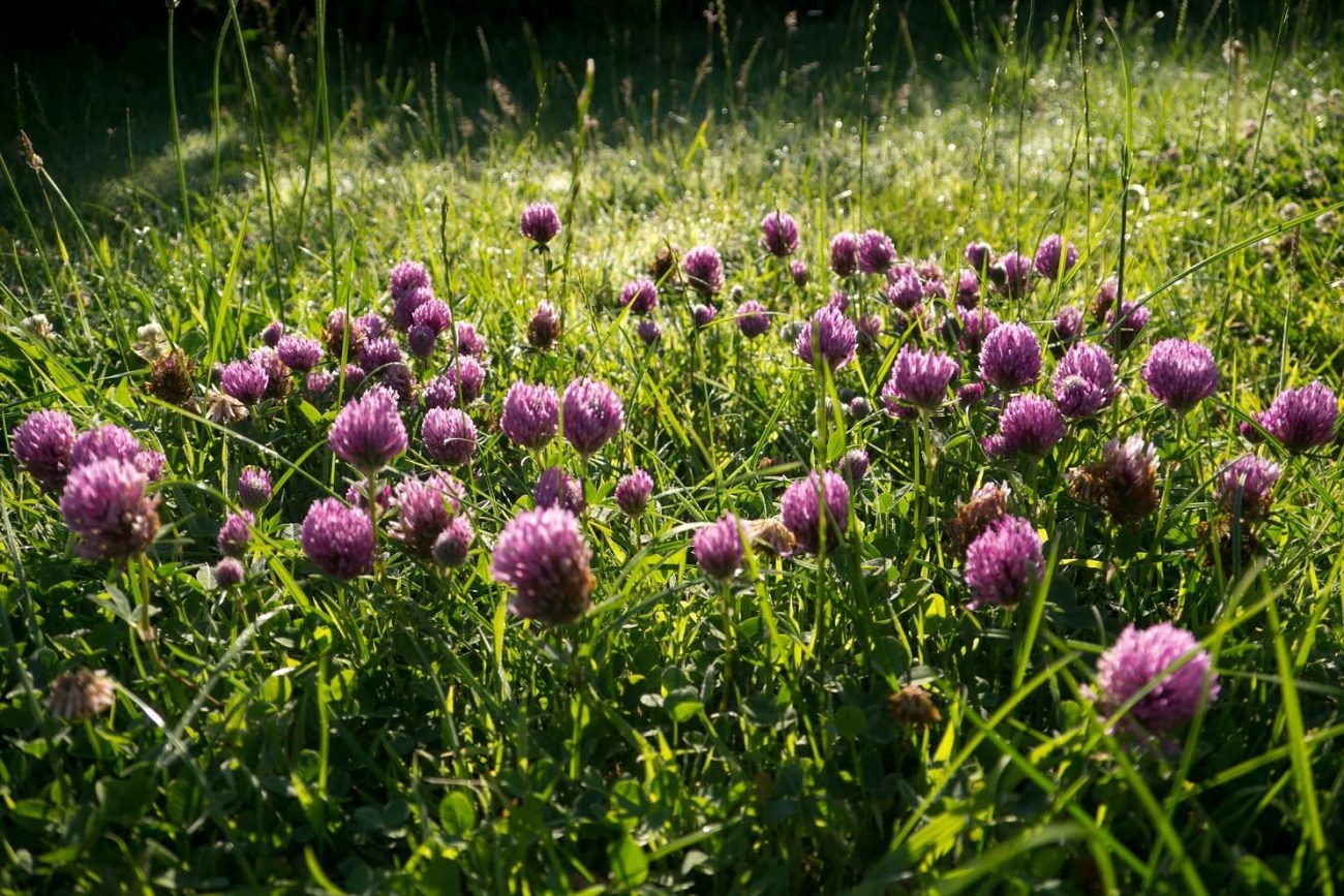 Red clover is a perennial plant that grows to heights of between 5-40cm. It has branching stems and the leaves are typical of the clover species. The flowers are a distinctive pinky red and consist of oval bunches of tiny individual trumpet-shaped flowers. It is native to Europe, Asia and Africa, but grows naturally throughout the UK. Red clover is widely distributed and common in meadows from May through to October.