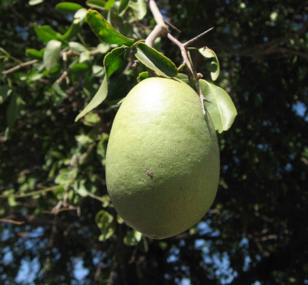 Bilva is a deciduous tree that can grow to heights of up to 8 metres. The branches have sharp spines and the flowers are a greenish-white colouring with a very sweet scent. The fruits are a large, greenish-white colour with a very tough and woody outer coating. Bilva trees will commonly grow in the Himalayas up to altitudes of 1200m.