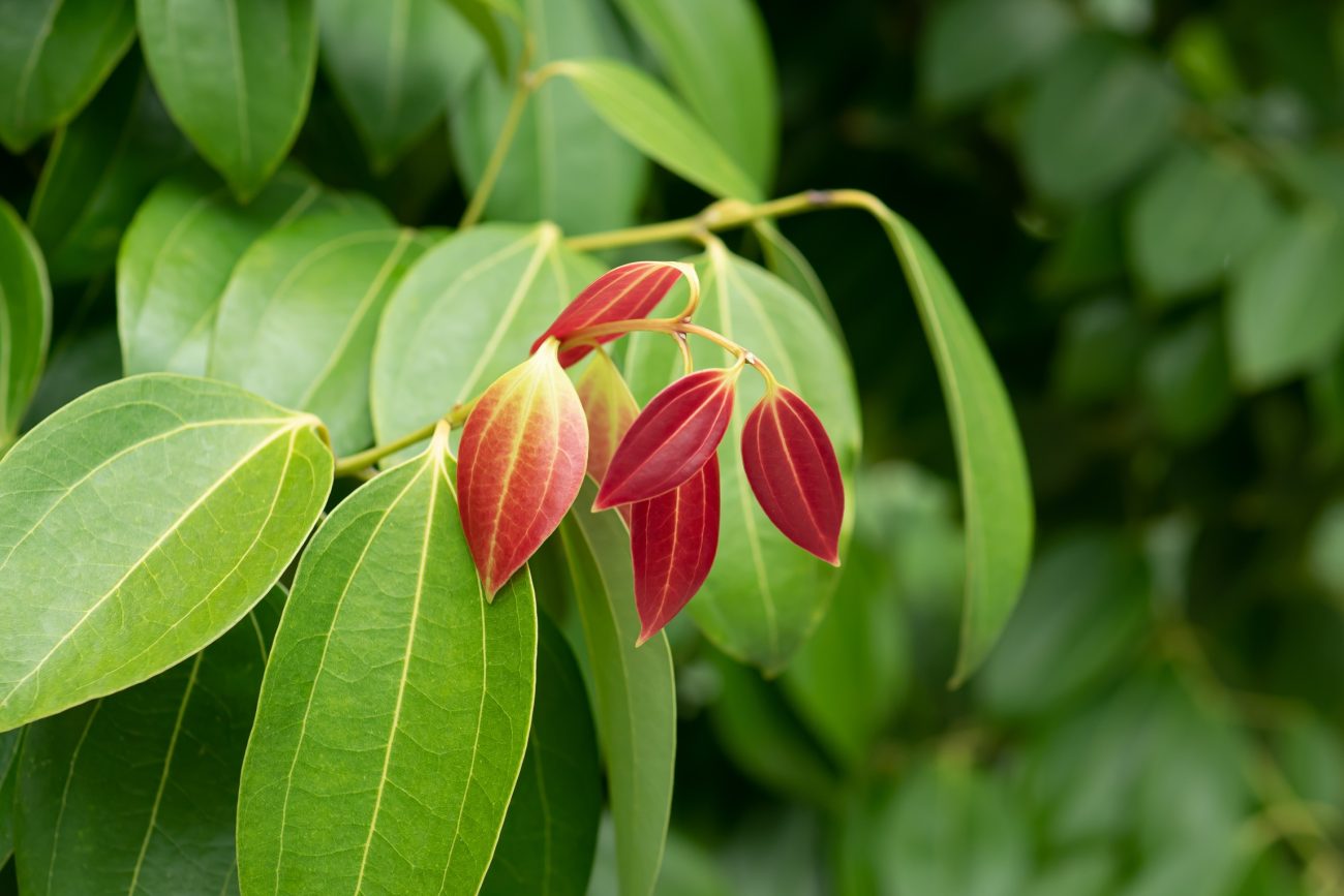 Cinnamon is a small-to-moderate, bushy, evergreen tree. It grows to about 52 feet (16 m) in height and has smooth, orange/ pinkish bark. Leaf growth, called a flush, begins in the monsoon season (June through September in the East). Leaf colour varies from green to deep purple. The fragrant flowers are small, pale yellowish-green, and are attractive to insects, particularly bees.