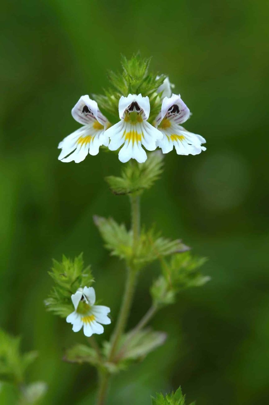 By the doctrine of signatures (a concept that states that botanical features of herbs may indicate their therapeutic applications) the petals of eyebright resemble bloodshot eyes, suggesting the plant’s name and its eye-clearing action. Downy hairs cover the stems, which produce toothed leaves.