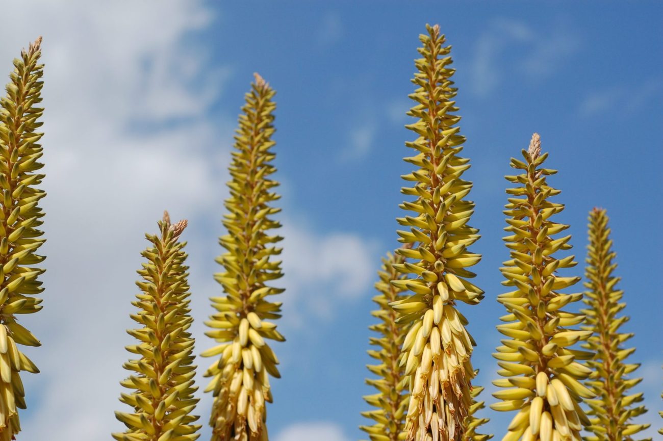 Aloe plants grow wild throughout the dry areas of India but its native country is not clear. It naturally grows in areas of North Africa, Arabia and Egypt but is now cultivated across the globe for both medicinal and ornamental purposes. The plant is part of the succulent family and can grow up to a metre in height and width with no distinct stem. The leaves are characteristically fleshy and hard with serrated edges appearing as ‘white teeth’ at intervals along its length. Its flowers grow on a spike from the centre of the plant, reaching up to a metre in height, and the flowers are small, yellow and tubular.
