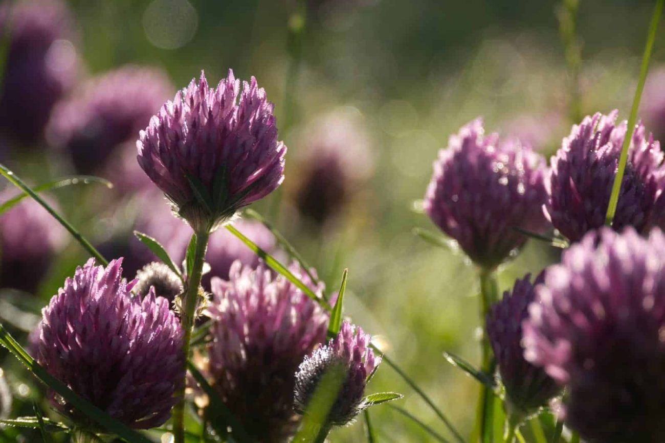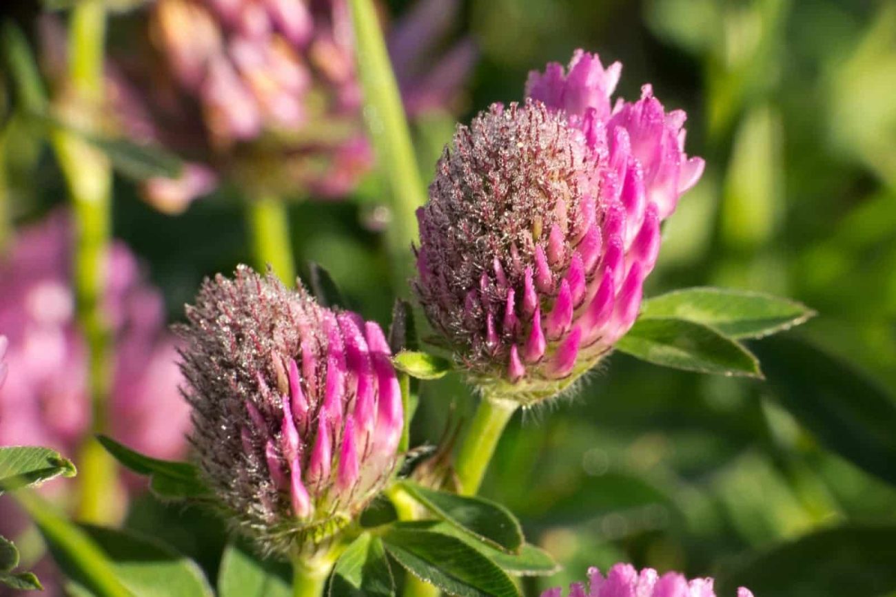 Red clover is a perennial plant that grows to heights of between 5-40cm. It has branching stems and the leaves are typical of the clover species. The flowers are a distinctive pinky red and consist of oval bunches of tiny individual trumpet-shaped flowers. It is native to Europe, Asia and Africa, but grows naturally throughout the UK. Red clover is widely distributed and common in meadows from May through to October.