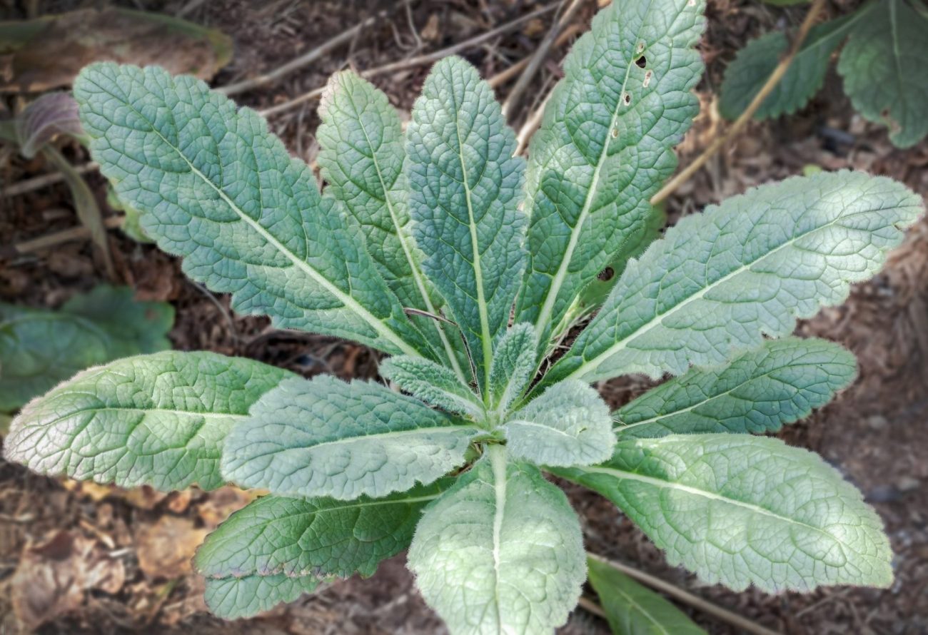 Flowers (each to approx 2” long) bloom in few-flowered spike-like terminal racemes or singly from leaf axils on purplish stems rising to 1’ tall from a basal rosette of coarsely toothed, obovate to oblong, rosulate leaves (to 3-5” long).
