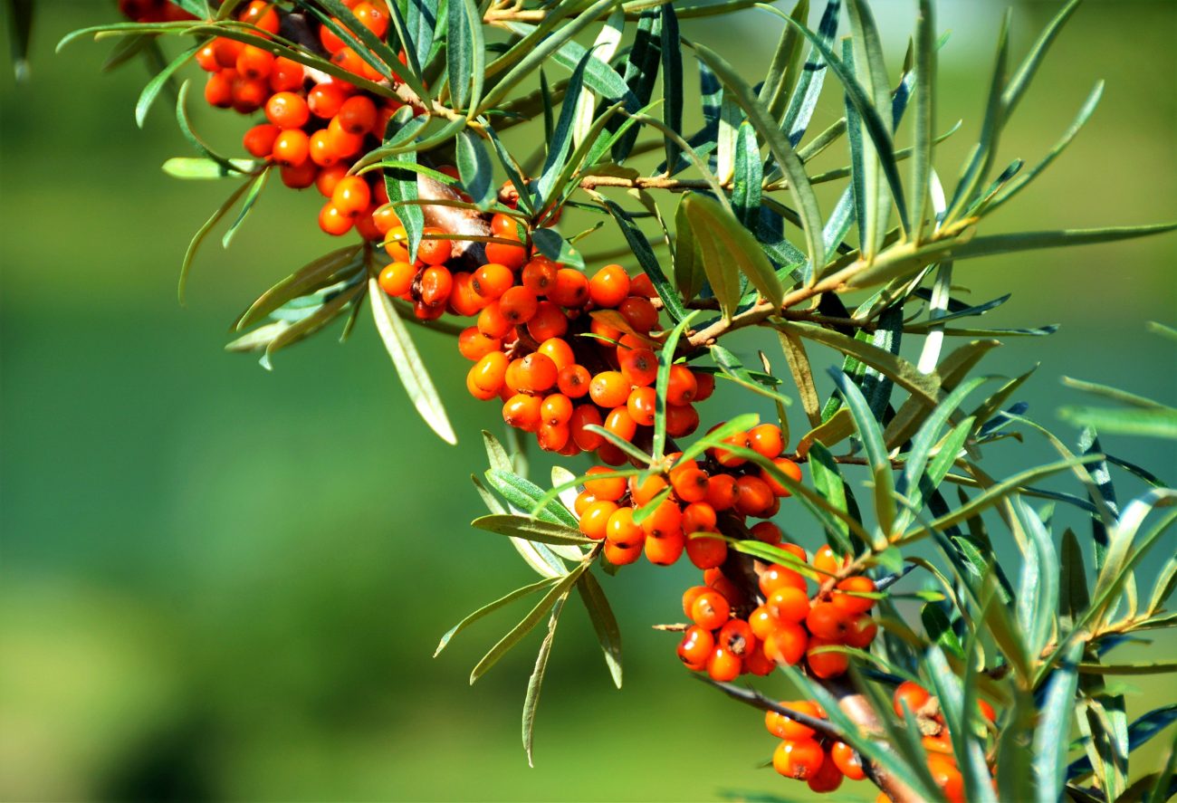 Sea buckthorn (Hippophae rhamnoides) Sea buckthorn berries can be juiced or pulped to give a tart but delicious juice rich in vitamins. An oil rich in omegas 3,6, 7 and 9 fatty acids can also be made by cold pressing the seeds or pulp. These constituents, in addition to the flavonoids, make sea buckthorn particularly useful as a support against infections. Sea buckthorn partners well with rosehips (Rosa canina) in autumn (1). The mixed powders are available to make tea or add to baking, muesli or smoothies. A tea made from sea buckthorn berries is rarely prescribed, however, due to the flavour profile (2). Over the past few years the berries have attracted a reputation as a nutritive superfood, being valued for their antioxidant effects and offering tonic support against the effects of menopause and ageing, including vaginal dryness and dry eyes (3).