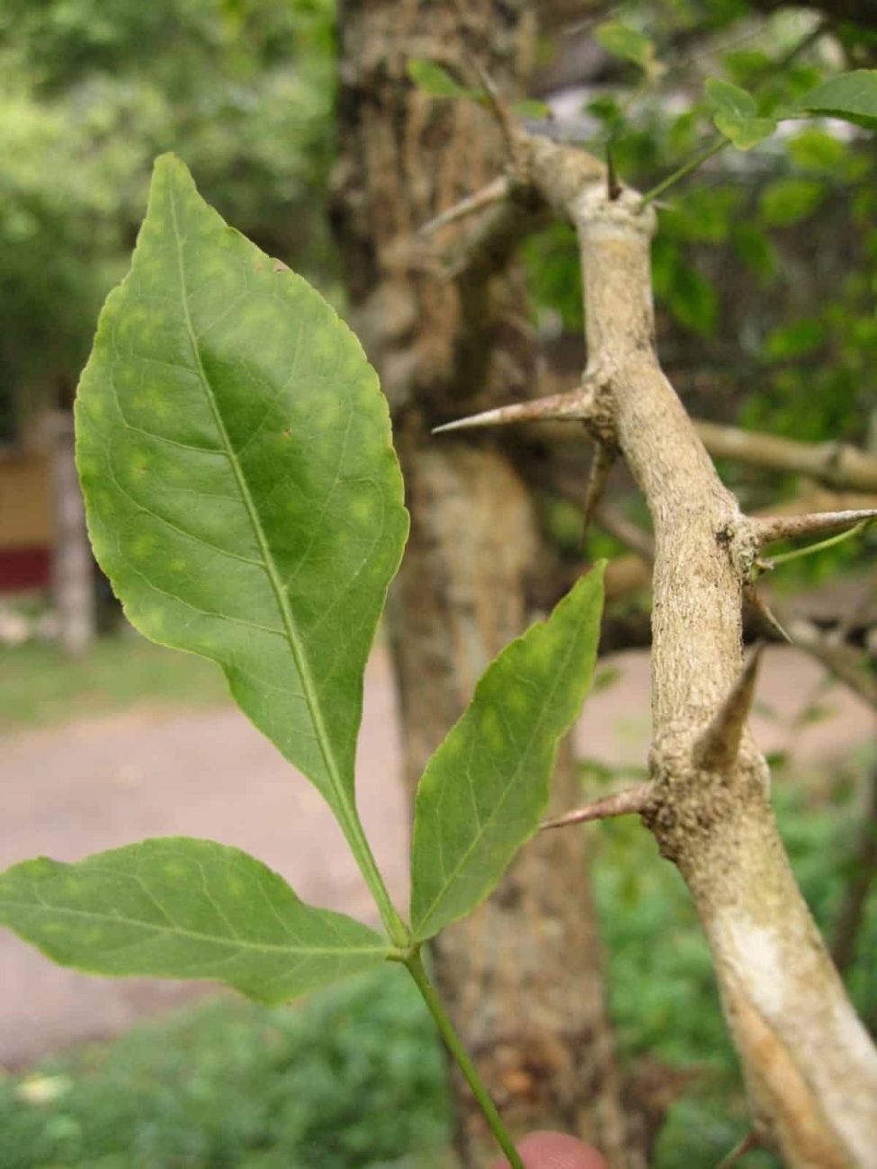 Bilva is a deciduous tree that can grow to heights of up to 8 metres. The branches have sharp spines and the flowers are a greenish-white colouring with a very sweet scent. The fruits are a large, greenish-white colour with a very tough and woody outer coating. Bilva trees will commonly grow in the Himalayas up to altitudes of 1200m.