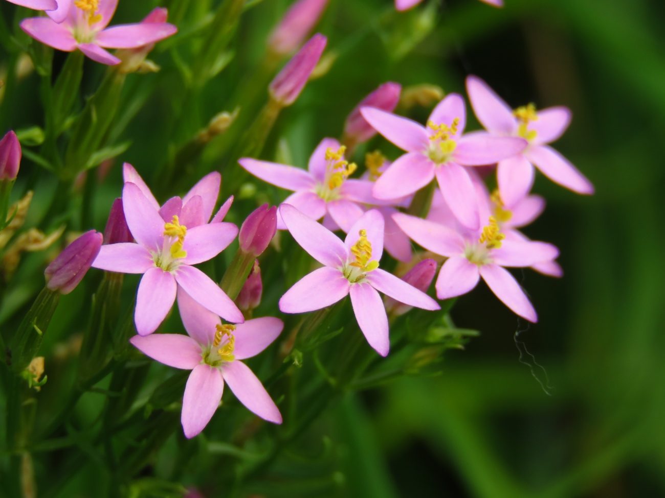 Centaury is a short and low-growing biennial herb, appearing from April to October, and flowering from June to October (22,23). The height can range from 2–50 cm, and the leaves are mostly in a basal rosette, broad, oblong, narrow at the base and blunted at the end (15,23). The stem leaves are pointed, lance-shaped, growing opposite at distant intervals along the stem (15). The square stem is straight, then branches towards the top, where the flowers develop in clusters (12). The flowers are five-petalled, star-like, clear pink, occasionally white, on short stalks approximately 1cm long (23). The flowers are sensitive to this light and only open in the sun, closing in cool temperatures and at night (12).