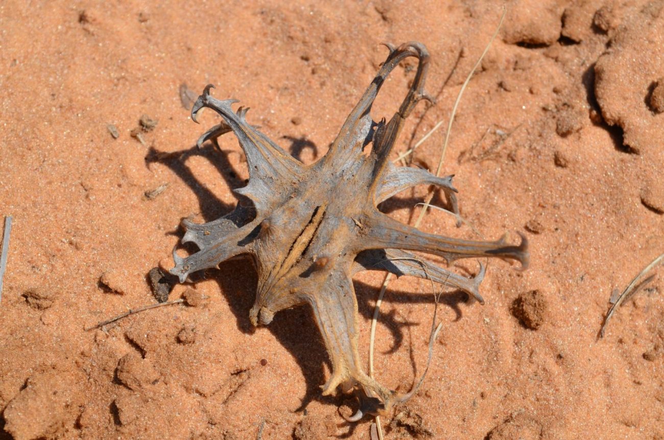 Devil’s claw has a nasty way of propagating itself. The name is supposed to have arisen from the desperate dance that animals use in an attempt to extricate from their feet the grappling claws on the fruit.